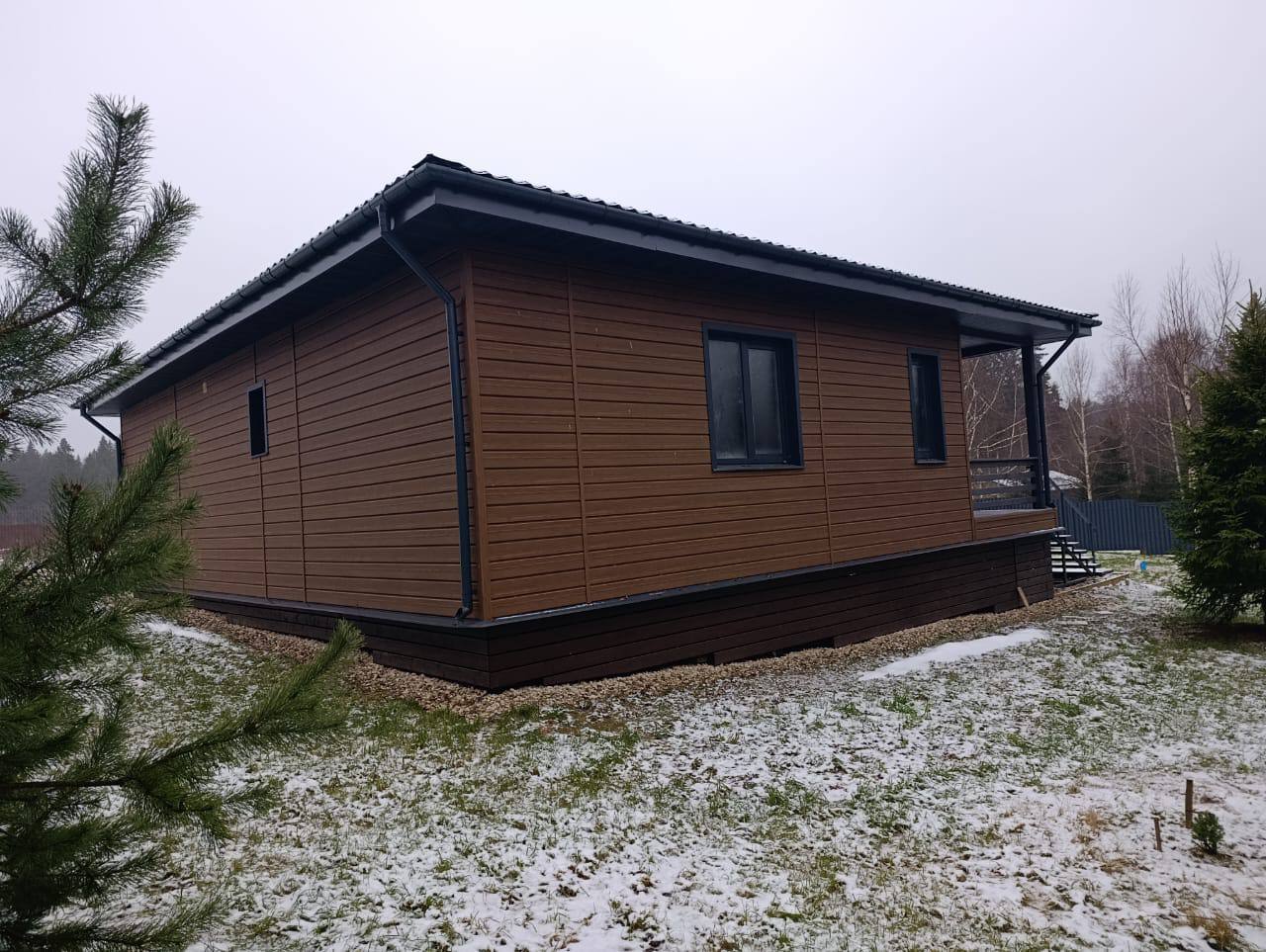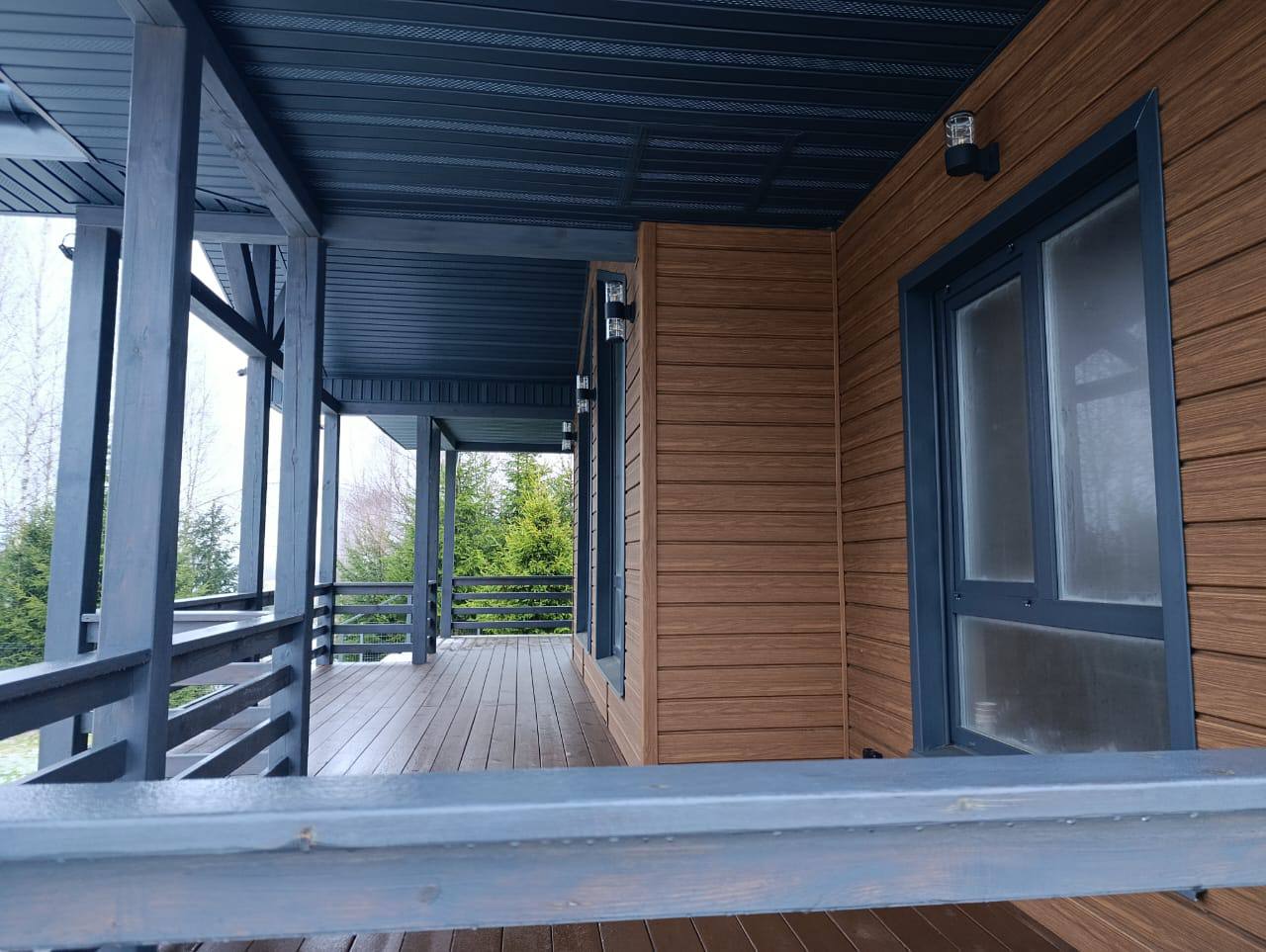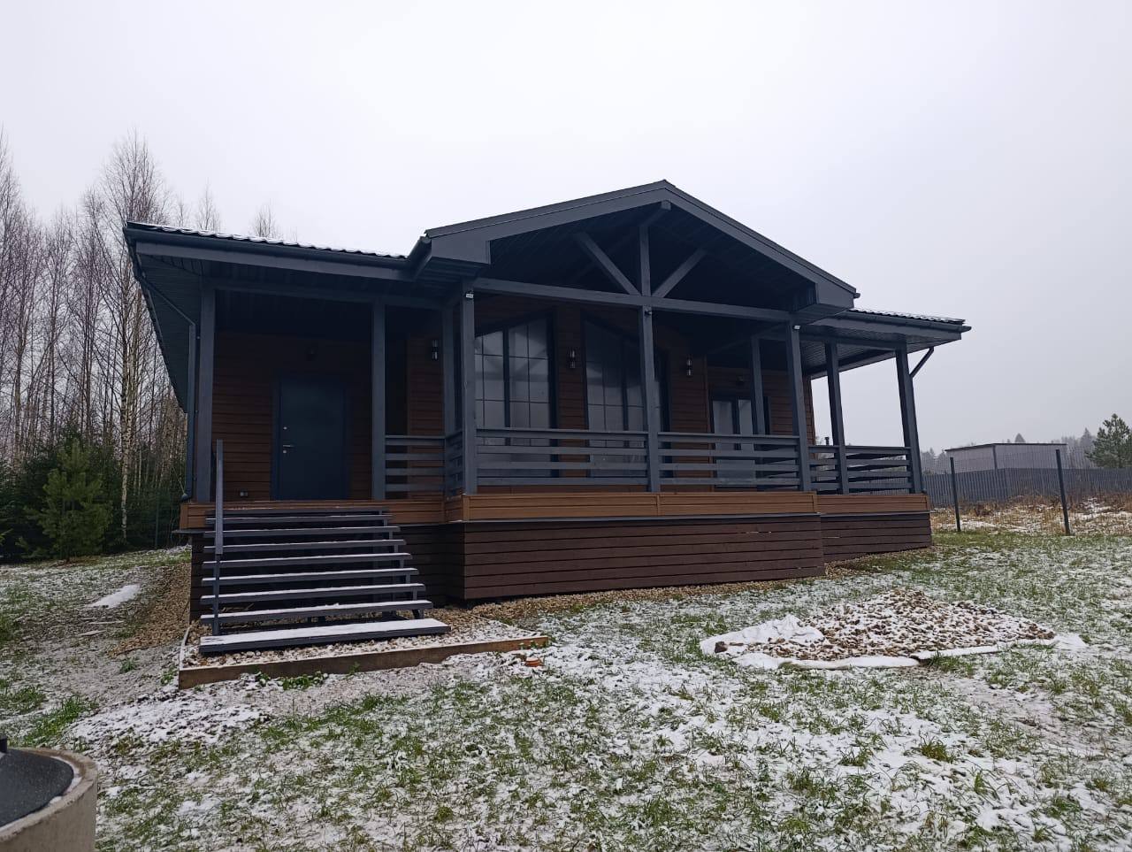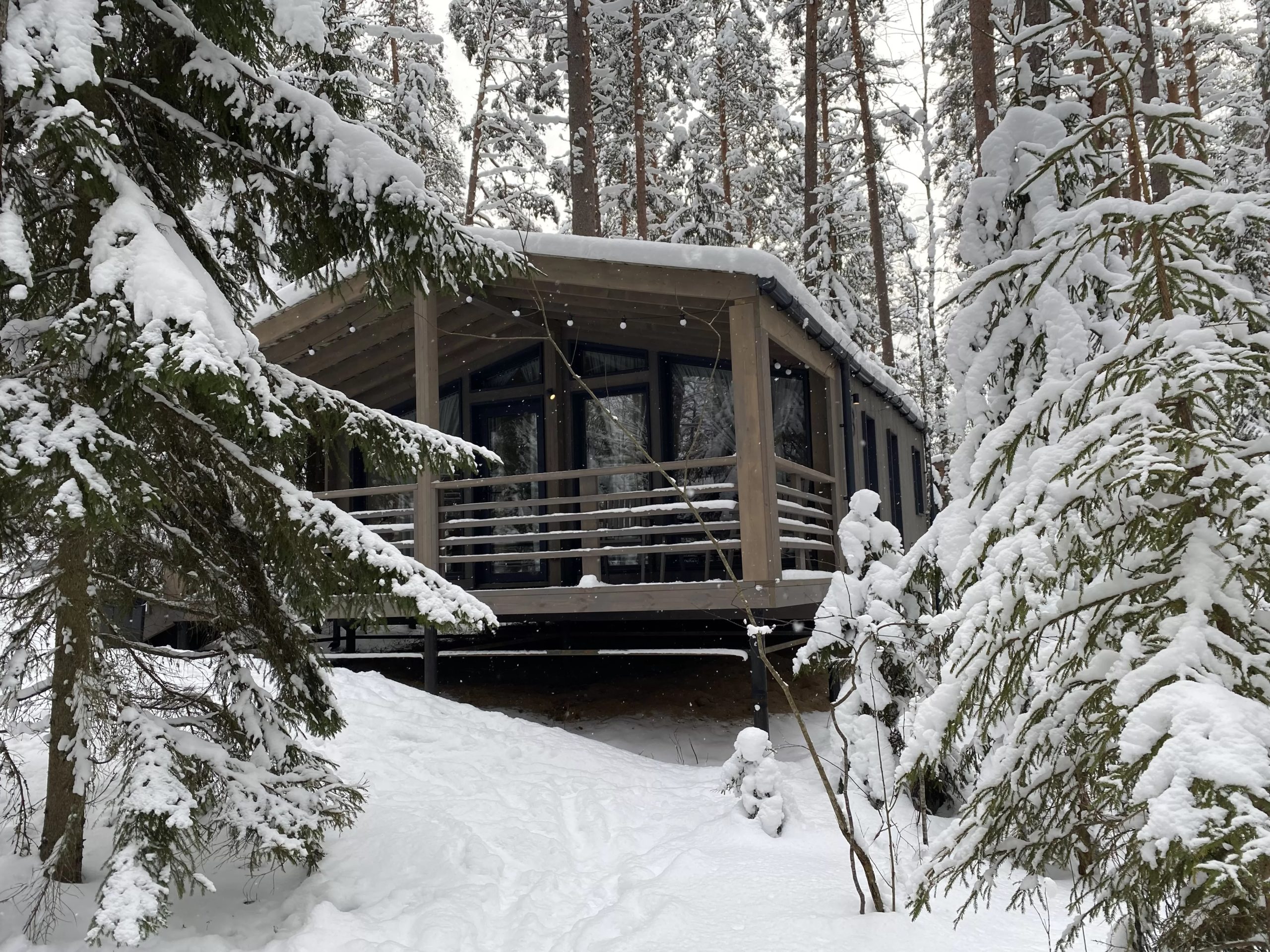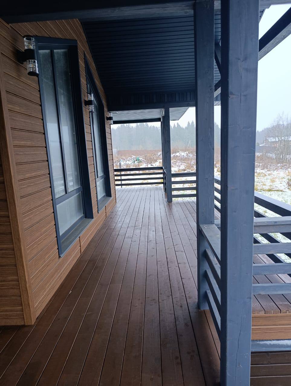 IMG 0199 IMG 0190 Деревянный домик, вдохновленный домом из клееного бруса, с большими стеклянными окнами и крытым крыльцом стоит в заснеженном лесу. С крыши свисают гирлянды, снег покрывает перила и землю в окружении высоких деревьев. Современный каркасный дом с большими окнами и крытым крыльцом расположился среди высоких сосен в заснеженном подмосковном лесу, создавая умиротворяющую зимнюю картину. Современный небольшой дом с большими стеклянными окнами, черным металлическим и деревянным сайдингом и крытым крыльцом с белыми перилами — идеальный пример каркасного дома в Московской области, расположенного в пышном, зеленом лесу.