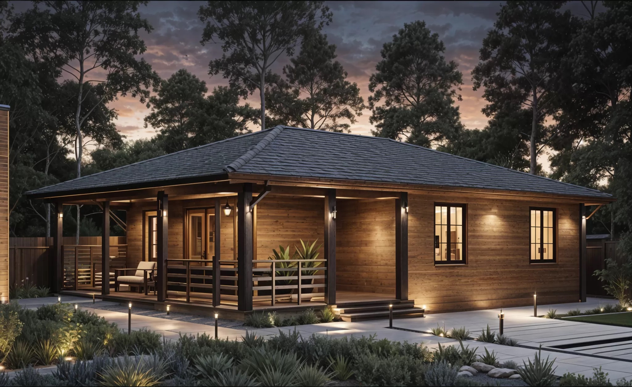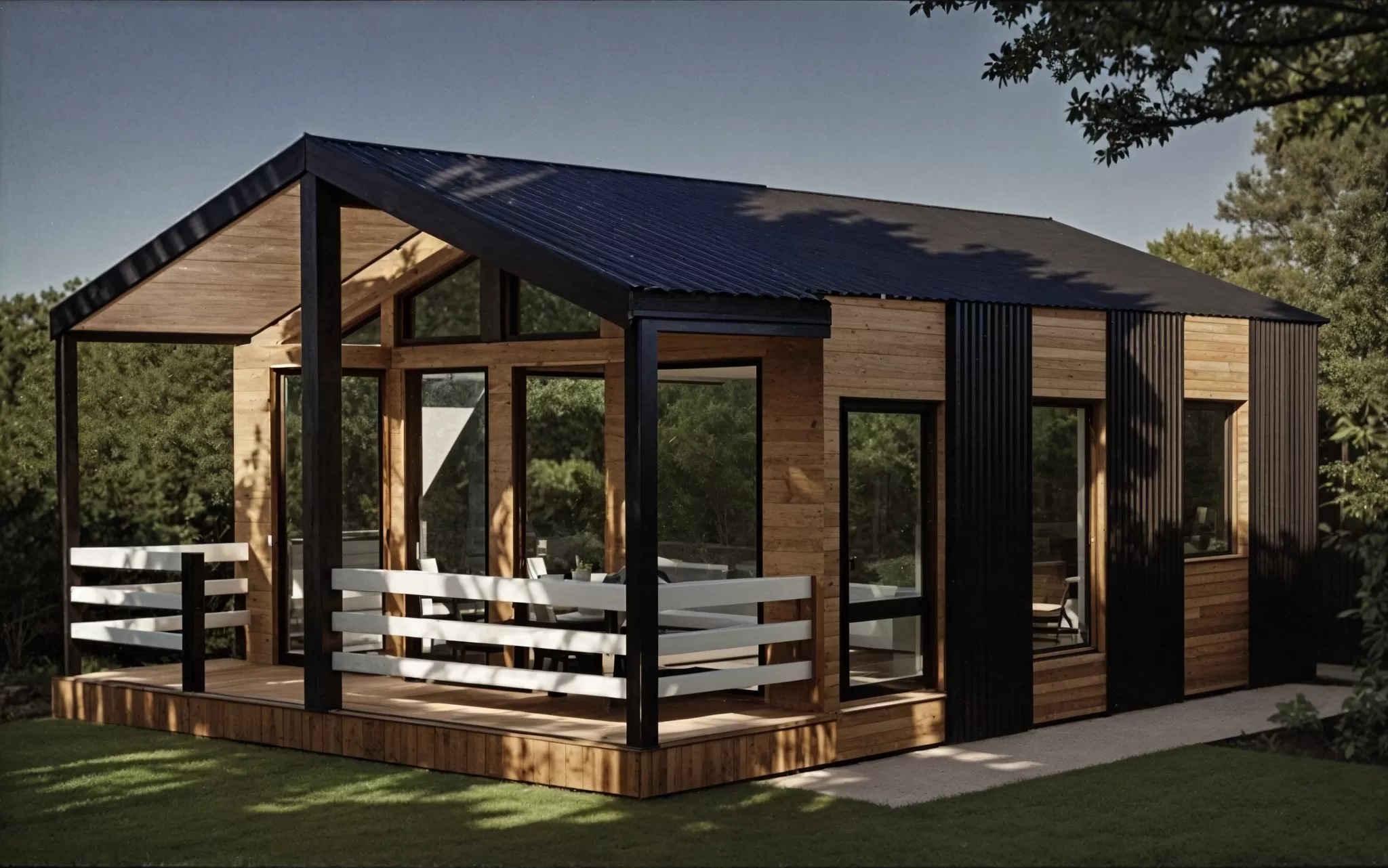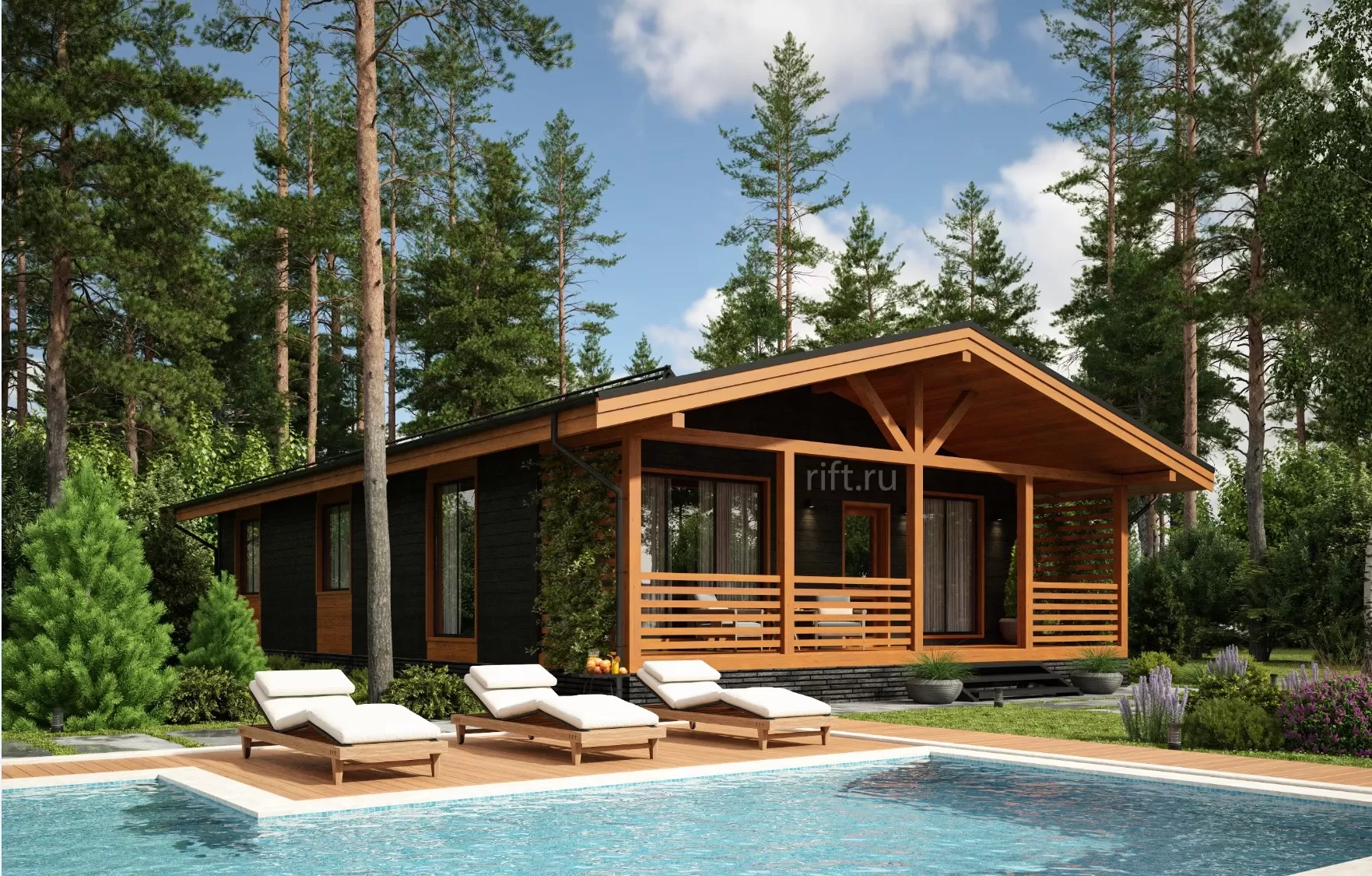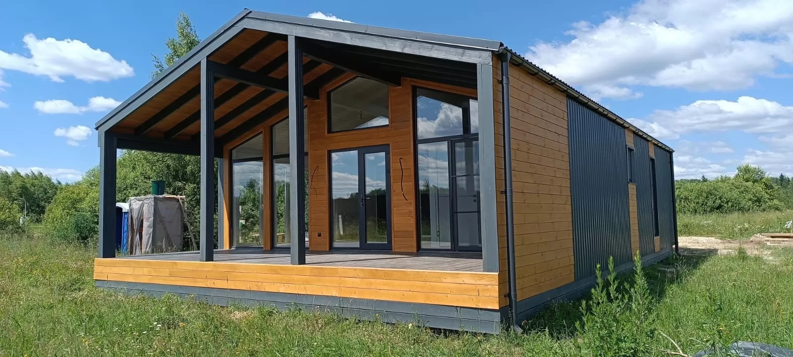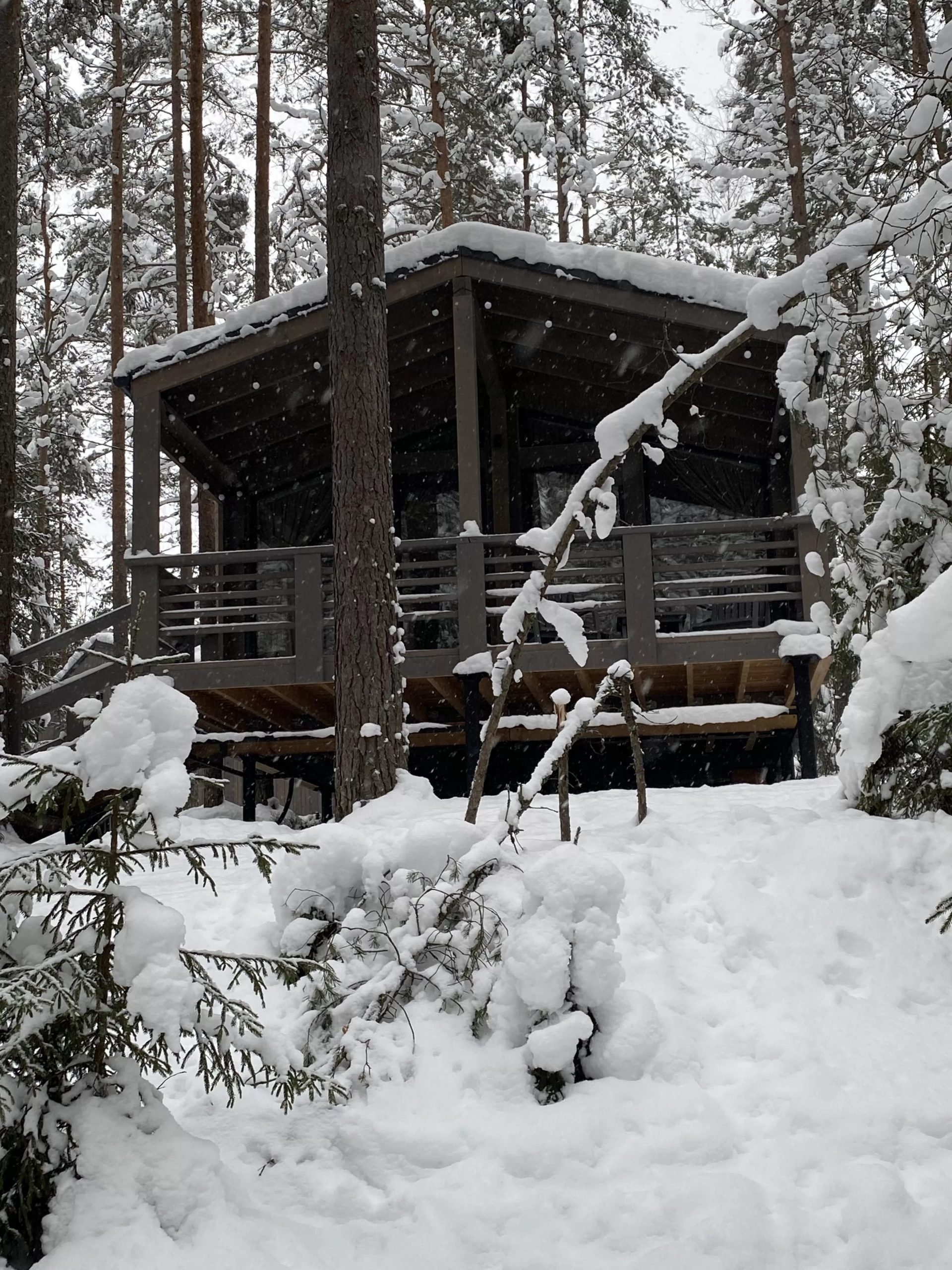 IMG 0199 IMG 0190 Деревянный домик, вдохновленный домом из клееного бруса, с большими стеклянными окнами и крытым крыльцом стоит в заснеженном лесу. С крыши свисают гирлянды, снег покрывает перила и землю в окружении высоких деревьев. Современный каркасный дом с большими окнами и крытым крыльцом расположился среди высоких сосен в заснеженном подмосковном лесу, создавая умиротворяющую зимнюю картину. Современный небольшой дом с большими стеклянными окнами, черным металлическим и деревянным сайдингом и крытым крыльцом с белыми перилами — идеальный пример каркасного дома в Московской области, расположенного в пышном, зеленом лесу.