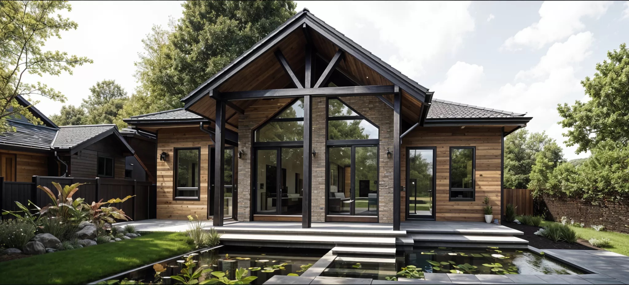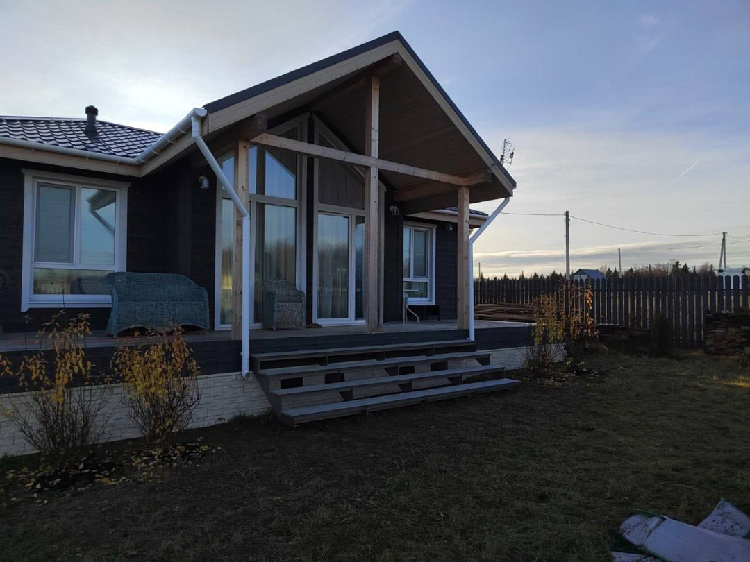 Современный двухэтажный дом с большими окнами, покатой темно-коричневой крышей, акцентами из дерева и камня и крытым крыльцом — идеальный пример каркасного дома в Московской области, окруженного деревьями и зеленью. Современный деревянный дом, построенный в стиле дома из клееного бруса, с большими окнами и темно-серой крышей стоит на травянистом участке. Небо пасмурное, на заднем плане видны соседние дома и деревья. Современный светло-коричневый деревянный дом с серой крышей и большим крытым крыльцом стоит на травянистой земле под частично пасмурным небом — отличный пример каркасных домов в Московской области. На заднем плане видны деревья и еще один дом. Современный двухэтажный каркасный дом с крутой двускатной крышей, большими окнами и крыльцом, возвышающийся на сваях, окруженный травой и частично пасмурным небом.