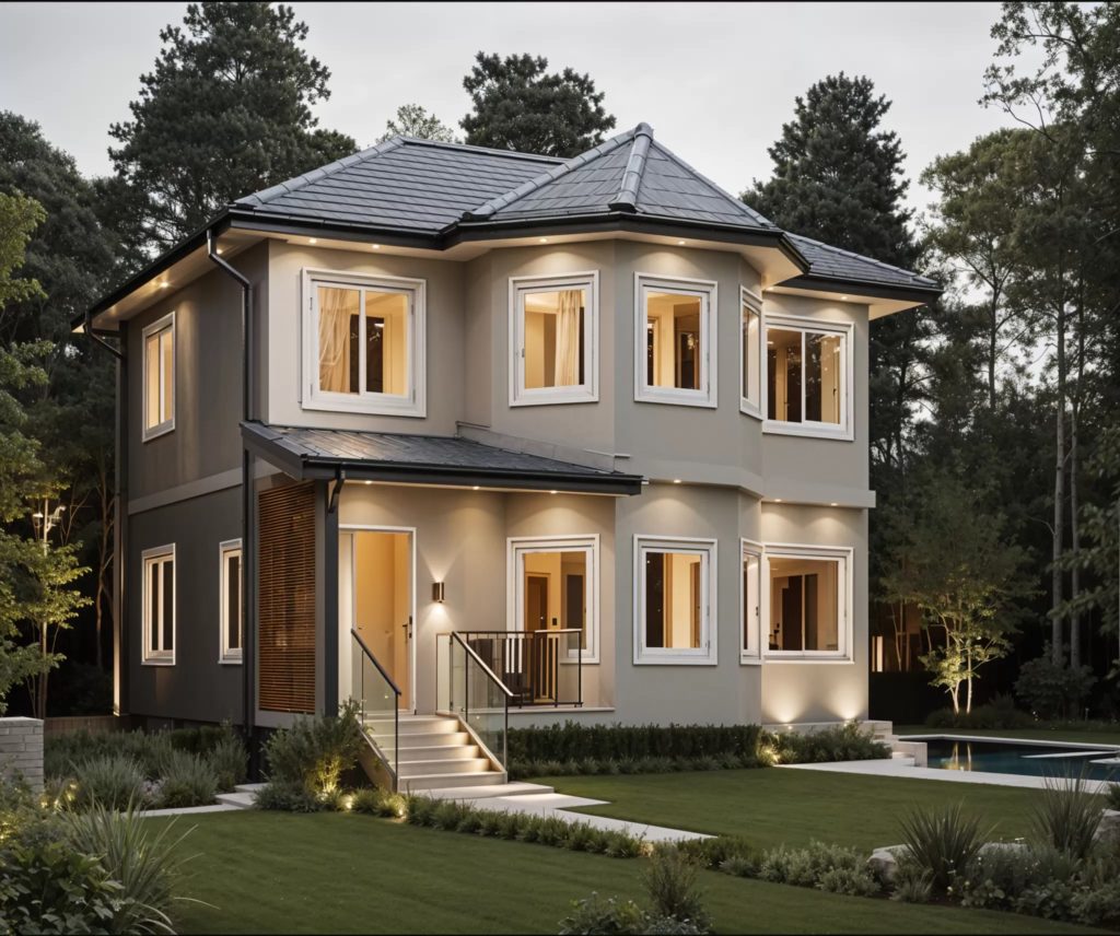 Коттедж «Модерн Лайфстайл» имеет большие панорамные окна, которые позволяют наслаждаться красивыми видами на природу. Благодаря использованию профилированного бруса, этот дом обладает отличными звукоизоляционными свойствами, что создает спокойную и уютную атмосферу внутри помещений.