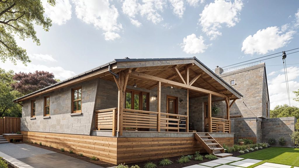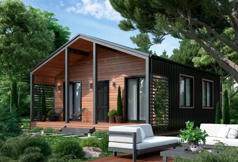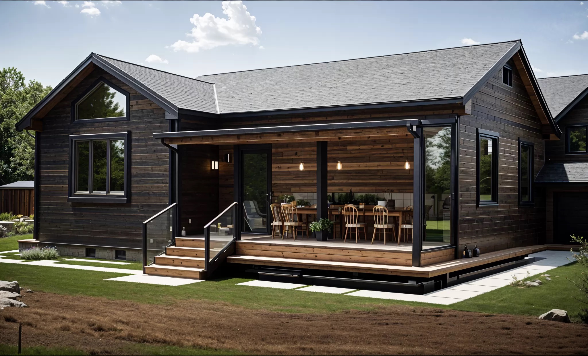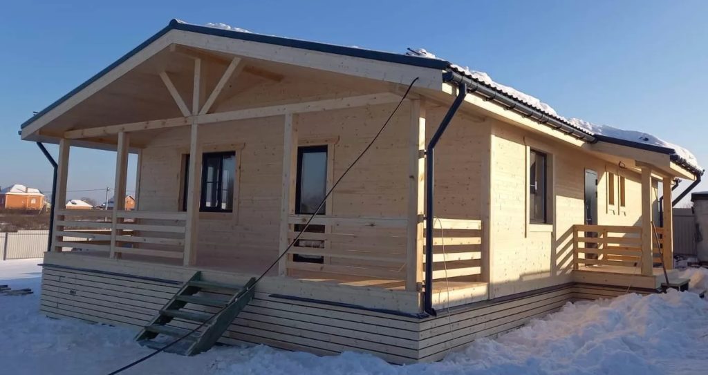 IMG 0199 IMG 0190 Деревянный домик, вдохновленный домом из клееного бруса, с большими стеклянными окнами и крытым крыльцом стоит в заснеженном лесу. С крыши свисают гирлянды, снег покрывает перила и землю в окружении высоких деревьев. Современный каркасный дом с большими окнами и крытым крыльцом расположился среди высоких сосен в заснеженном подмосковном лесу, создавая умиротворяющую зимнюю картину. Современный небольшой дом с большими стеклянными окнами, черным металлическим и деревянным сайдингом и крытым крыльцом с белыми перилами — идеальный пример каркасного дома в Московской области, расположенного в пышном, зеленом лесу.